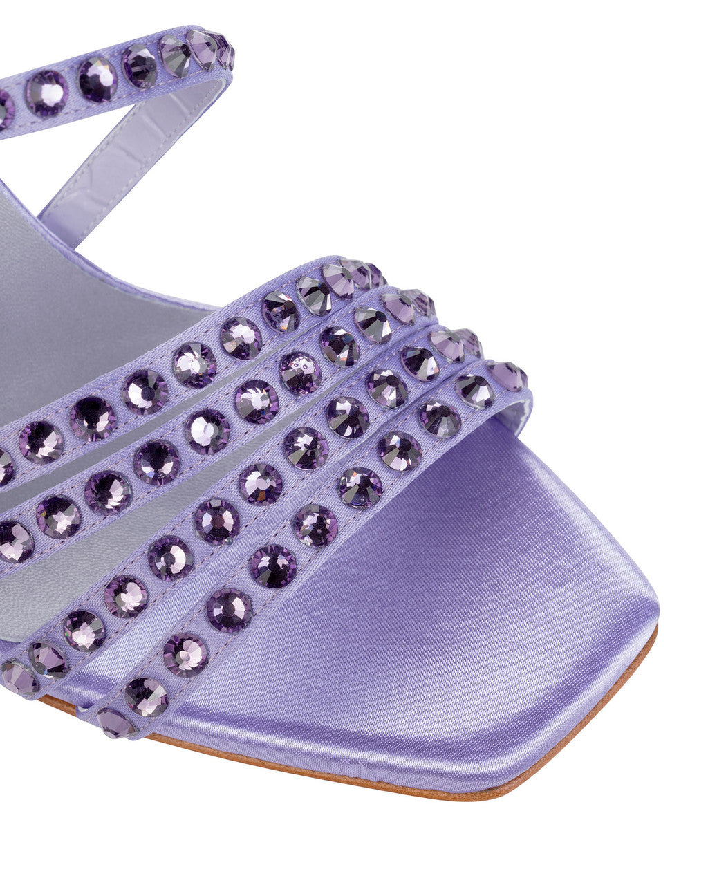 Bianca Buccheri Sanremo Violet Sandals: Step into the world of elegance and luxury with Sanremo, where gemstone embellishments and a captivating colours unite to create a footwear masterpiece. Whether you're attending a gala or enjoying a night on the town, these heels promise sophistication and confidence with every step. Sanremo features four straps elegantly crossing over the toes and one strap gracefully positioned across the top of the foot. Each strap on Sanremo is lavishly covered in dazzling gemstones that catch and reflect the light, creating a mesmerizing effect. These gemstones add a touch of opulence and create a captivating focal point for your look. Heel Height measures to approx 9.5cm. 100% Genuine Leather. Made in Italy.